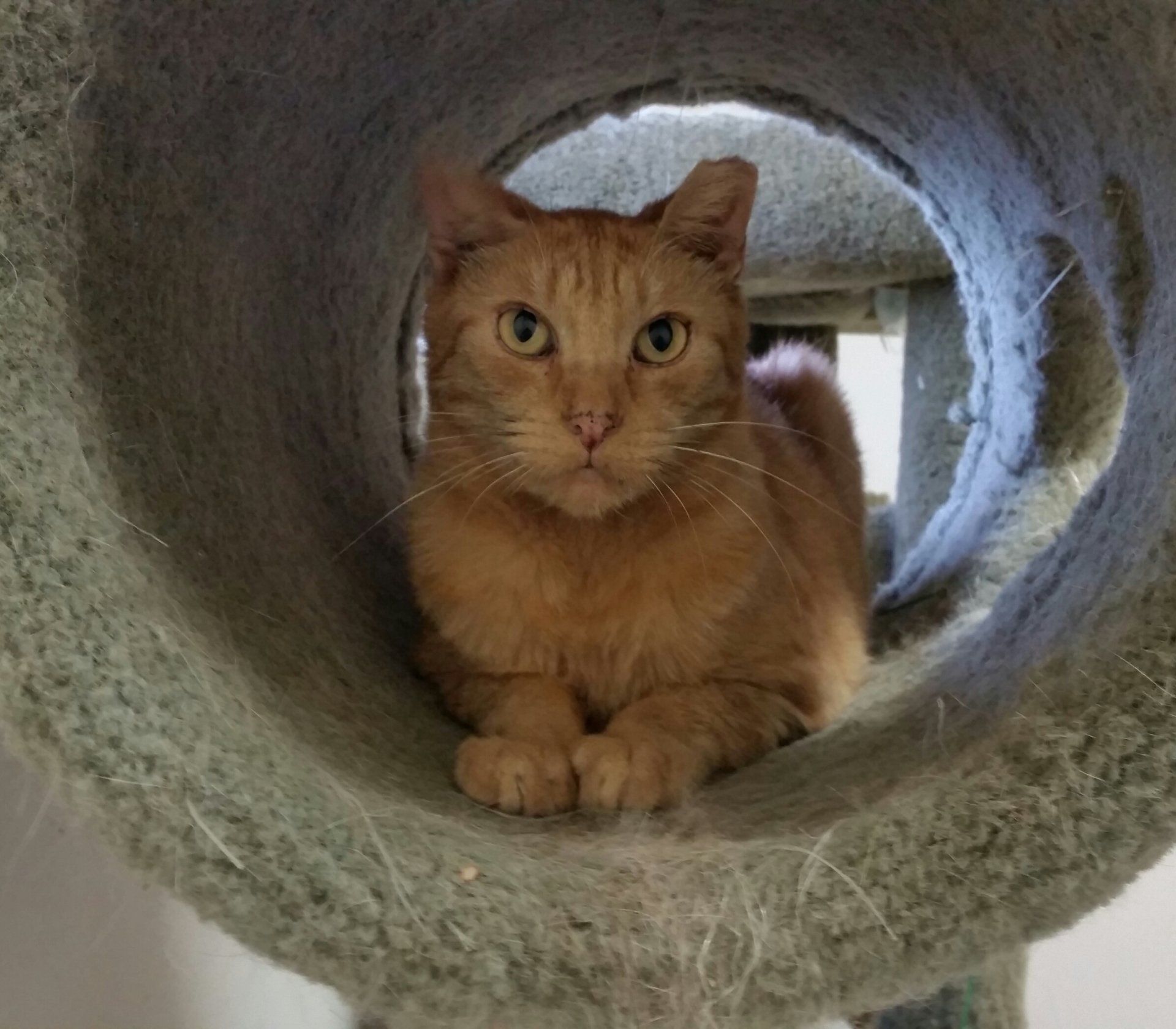 There are times when it seems we have "clinic cats", but these felines are more often than not rescue cats who "reside" with us while looking for a permanent home. This does not stop them from becoming "our pets" even if for a short time. Guy, adorable orange senior citizen, IS "our" cat. Guy spends his days snoozing or eating. When we have kittens here, Grandpa Guy loves to watch them and allows "tail time".